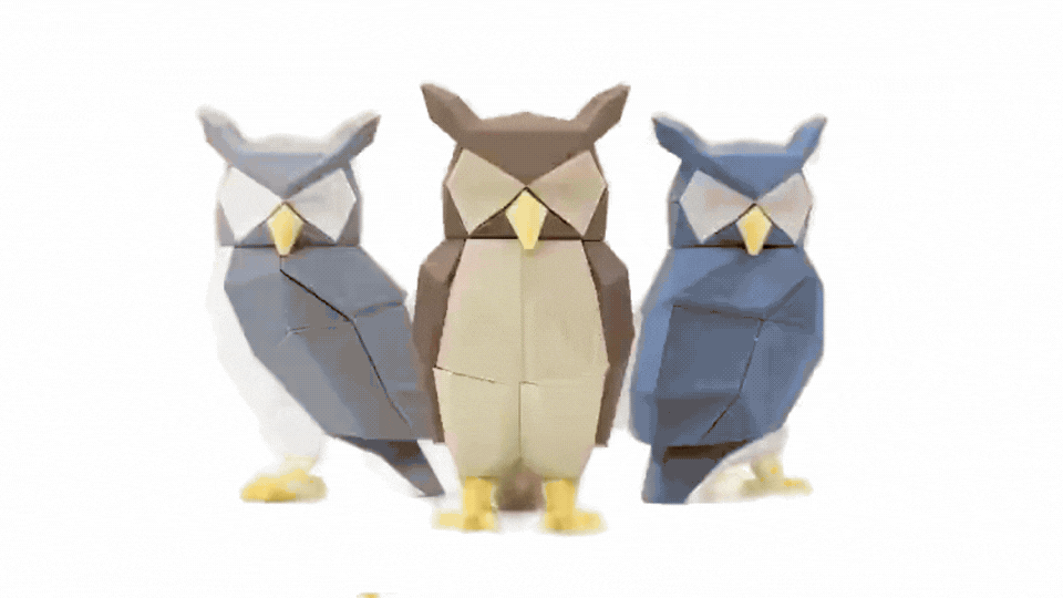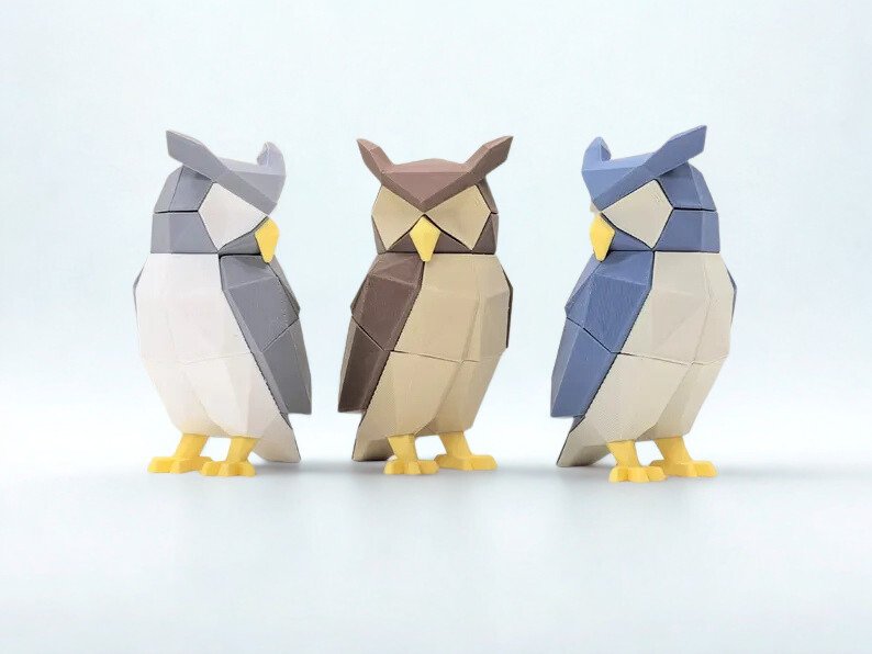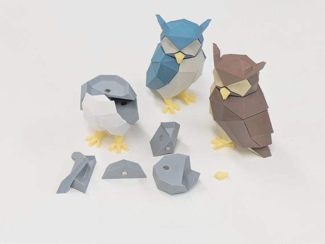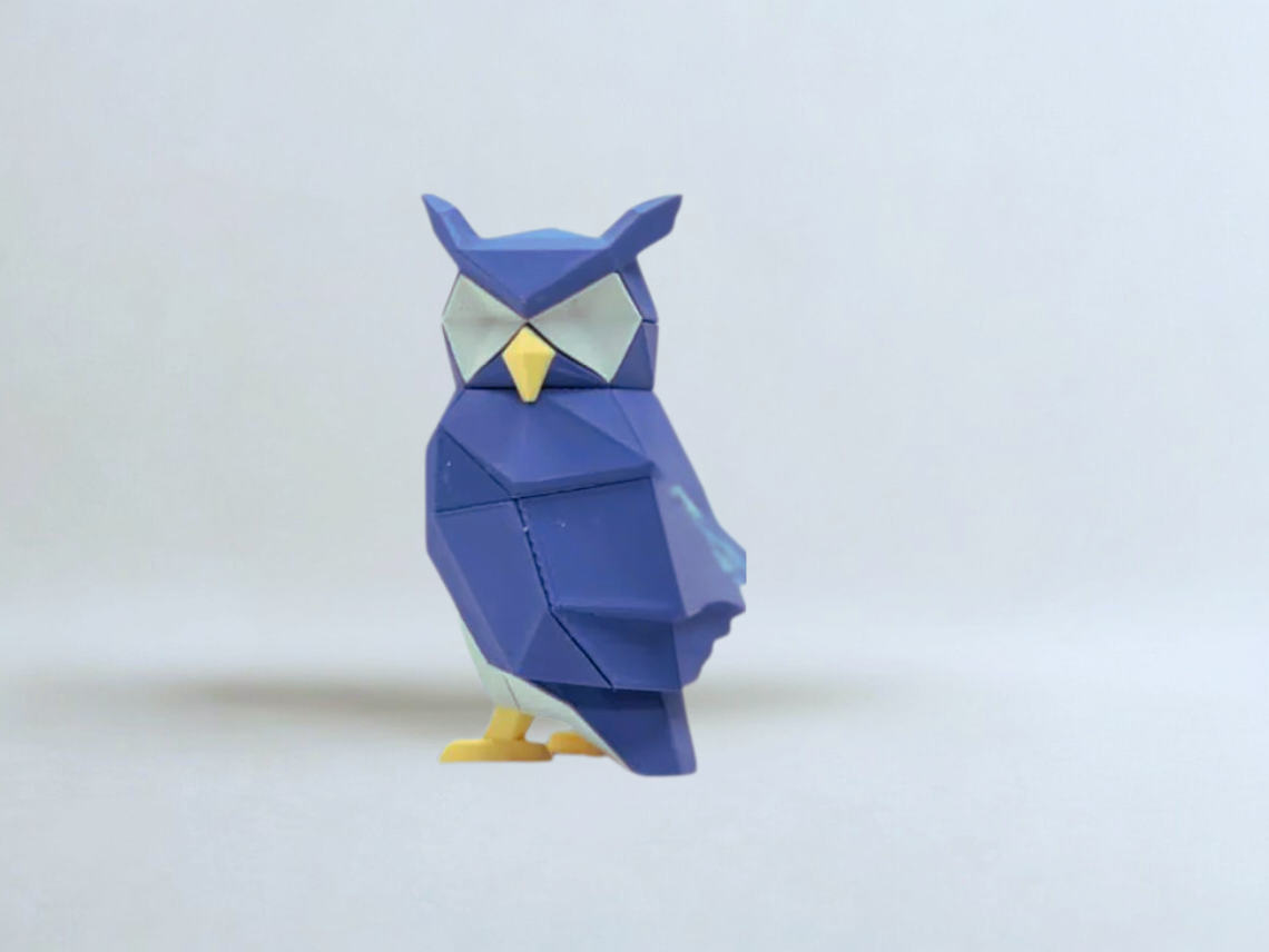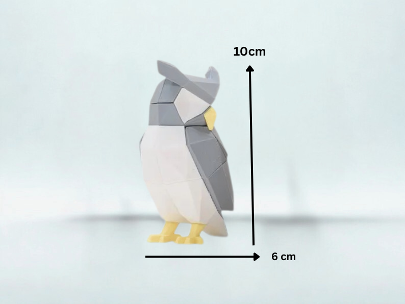 Este búho 3D se arma uniendo sus piezas con imanes de neodimio, diseñados para que solo se ajusten al llegar a su posición correcta, facilitando el armado y evitando errores.